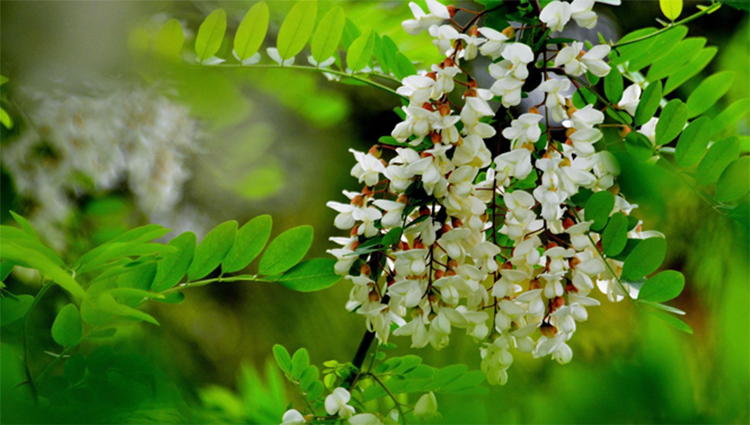 “裊裊秋風多,槐花半成實”。槐花,又名洋槐花,在中國各地廣為栽培,尤以我國黃土高原、華北平原一帶為主。槐花(洋槐)為多生花,總狀花序,蝶形花冠,盛開時成簇狀,重疊懸垂,小花多皺縮而卷曲,花瓣多散落,完整者花萼鐘狀。槐花在每年的4、5月份開花,花期一般為10-15天。每逢花期,串串潔白花苞綴滿枝頭,清風拂過,空氣中彌漫陣陣素雅芳香,沁人心脾。在農村,槐花既可制作槐花荊芥飲、槐菊茶、大黃槐花蜜飲等茶飲,亦可作餡包成槐花包子、槐花餃子、槐花煎餅等。