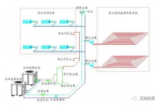 首先我們要了解什么是空氣源熱泵采暖。空氣源熱泵采暖是指空氣源熱泵+采暖末端(地暖、暖氣片等)+水管、閥門等輔件組成的一套取暖系統。這套取暖系統的核心是空氣源熱泵主機,空氣源熱泵工作時利用少量電能驅動熱泵運行,吸收空氣中的低溫熱量并增溫壓縮成高溫熱能,再通過換熱器將高溫熱能交換到冷水中,將冷水升溫,之后利用水管,將熱水輸送到室內,通過采暖末端為室內提供溫度和熱水。