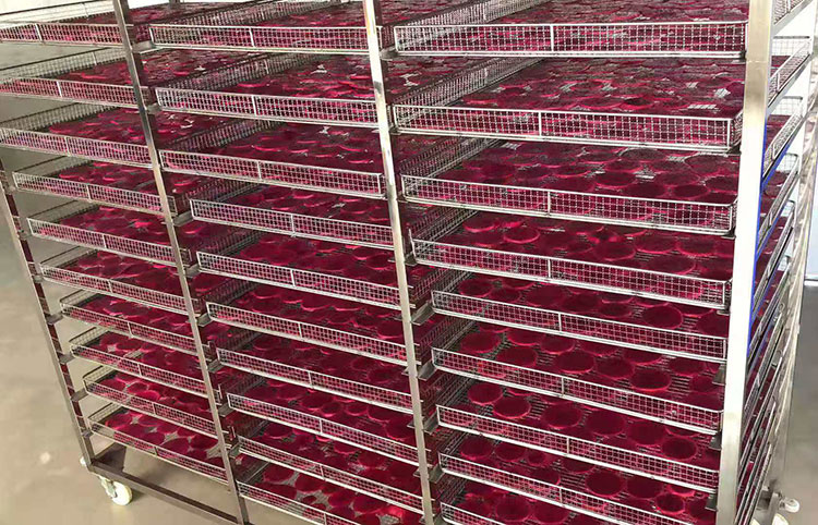 烘干物料絕對的均勻是不可能的,只能是盡量均勻。一次烘干數(shù)量和物料擺放密集程度都是影響烘干均勻度的重要原因。不同產(chǎn)品大小、體積和干濕程度都不一樣,需要根據(jù)實際做到機組大小和烘干物料的多少的匹配。一些體積大、重量輕的物料,比如鮮花,與體積小而重量大的物料,例如天麻、核桃,在進行烘干作業(yè)時它們的風(fēng)量和溫度要求存在很大差異。相對而言,鮮花由于體積大,烘干時間短,因此烘架可以多設(shè)計一些,擺放也可以密集一些,但必須控制在合理范圍內(nèi)。