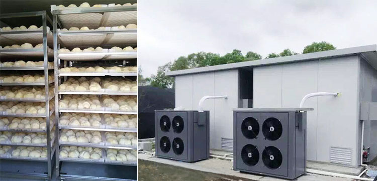 以正旭在哈爾濱某猴頭菇基地烘干項目為例,該項目共有8個烤房,共安裝了8臺15P正旭分體式空氣源熱泵烘干機。設(shè)計每個烘烤房最高溫度70℃,每次烘干3000公斤,除水量60%,烘干時間60個小時。項目自2016年完工以來,七年間一直穩(wěn)定運行,得到客戶的積極認(rèn)同。